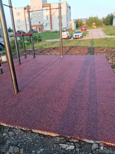 Устройство детских площадок из резиновой крошки безопасно и долговечно. Резина в составе амортизирует падения ребенка. Такое покрытие для игровых или спортивных площадок называют «мягким асфальтом». Чтобы получить слой резиновой крошки 1 см понадобится до 8 кг переработанных изношенных покрышек.