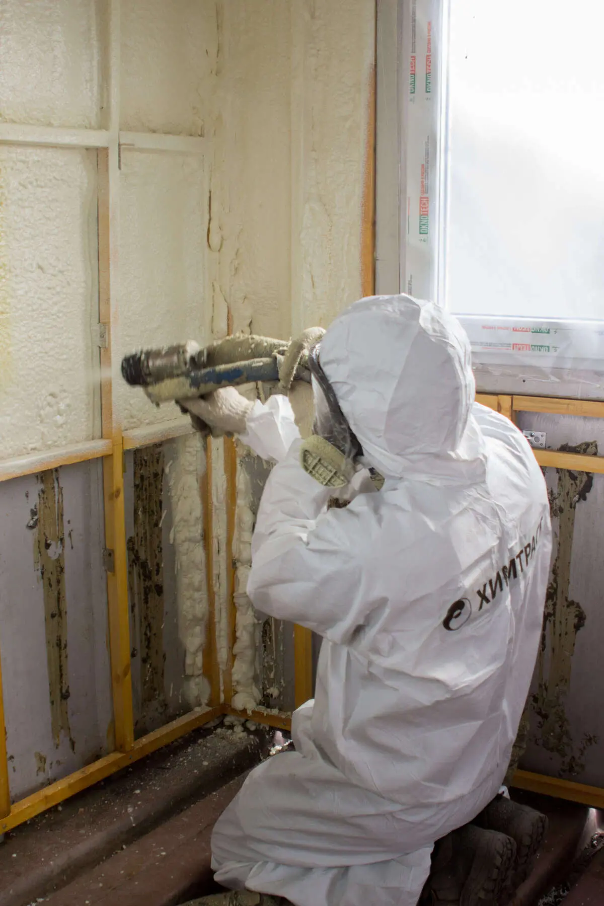 Перед началом напыления пенополиуретана при утеплении лоджии нужно подготовить все компоненты. Например, продукты компании «Химтраст» поставляют в двух тарах. В одной полиольный, в другой изоционатный компонент. С помощью специальной установки подогреть компоненты до температуры, указанной в инструкции. Работать с материалом нужно только в защитном костюме, респираторе, очках и перчатках. Предварительно рекомендуем провести небольшой тест на участке поверхности, чтобы отрегулировать подачу компонентов и проверить качество пены.